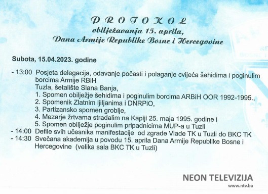 Savez demobilisanih boraca TK nizom aktivnosti obilježava Dan Armije RBiH, te će centralna svečanost se održati u subotu, 15. aprila u Tuzli.