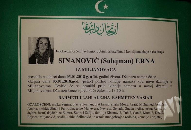 Posljednji ispraćaj i dženaza Erni Sinanović,  danas poslije ikindije namaza kod nove džamije u Miljanovcima. Tevhid će se poroučiti u novoj džamiji u Miljanovcima.