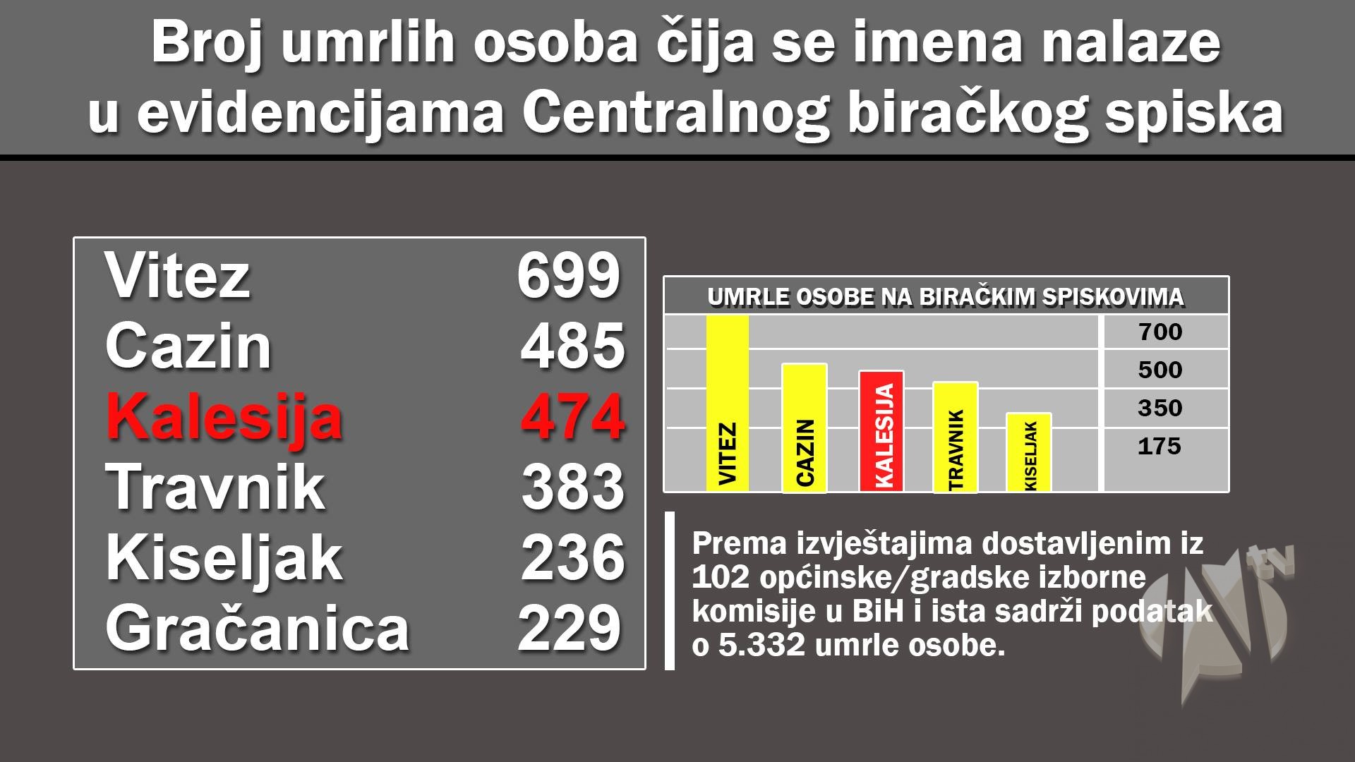 Informacija je sačinjena prema izvještajima dostavljenim iz 102 općinske/gradske izborne komisije u BiH i ista sadrži podatak o 5.332 umrle osobe čija se imena nalaze u evidencijama Centralnog biračkog spiska a za koje su izborne komisije uspjele izvršiti provjeru činjenice smrti. Prema navedenoj informaciji imena 474 osobe nalaze se na biračkom spisku općine Kalesija, što je čini trećom po redu općina/gradova najavećim brojem umrlih osoba koje imaju pravo glasa na izborima .
