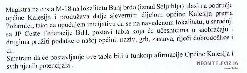 Hasan Ramić: Da nadležni općinski organi na magistralnoj cesti M 18 na lokalitetu Banj brdo postave tablu sa natpisom “Općina Kalesija-Dobrodošli” i drugim prigodnim sadržajem.