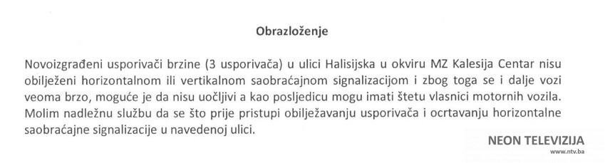 –Mirsad Omerović: Obilježavanja horizontalnom i vertiklanom simalizacijom usporivači brine u naselju Olanovica, MZ Kalesija Centar. Incijativa je usvojena sa 20 glasova ZA i 2 uzdržana.
