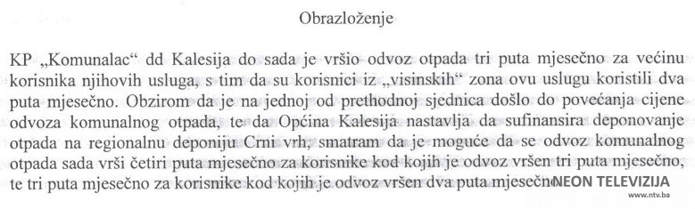 –Armin Karić: Da KP “Konunalac” dd Kalesija od 1. marta vrši odvoz komunalnog otpada četiri puta mjesečno od korisnika kod kojih je do sada vršen tri puta mjesečno, te ri puta mjesečno od korisnika kod kojih je do sada vršen odvoz komunalnog otpada dva puta mjesečno. Inicijativa je usvojena sa 20 glasova ZA i 2 uzdržana glasa.