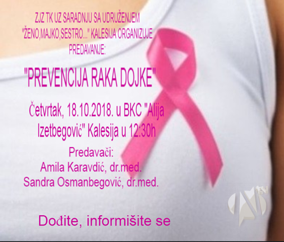 Zavod za javno zdravstvo Tuzlanskog kantona će nizom aktivnosti obilježiti ovaj važan mjesec između kojih je i aktivnost sa udruženjem žena “Ženo, majko, sestro…” u Kalesiji.  U četvrtak 18.10.2018.godine u BKC “Alija Izetbegović” Kalesija, sa početkom u 12:30 sati  bit će upriličeno i stručno predavanje na temu “Prevencija raka dojke” i podjela zdravstveno – edukativnog materijala.