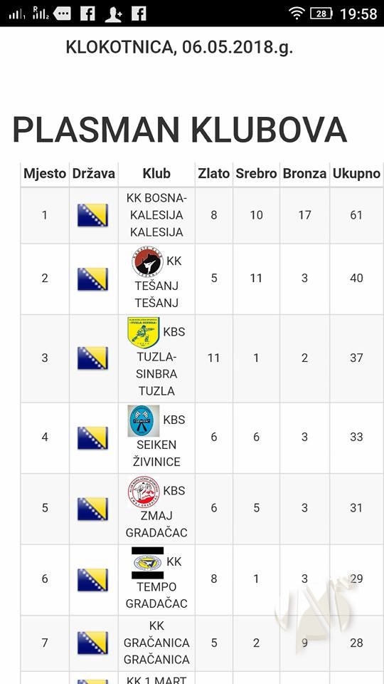 U konkurenciji 23 kluba,371 takmičara i 24 ekipe KK “Bosna” Kalesija ponovo osvojio prvo mjesto u ukupnom poretku klubova. Kalesijski karatisti osvojili su 35 medalja i to:8 zlatnih, 10 srebrenih, 17 bronzanih.