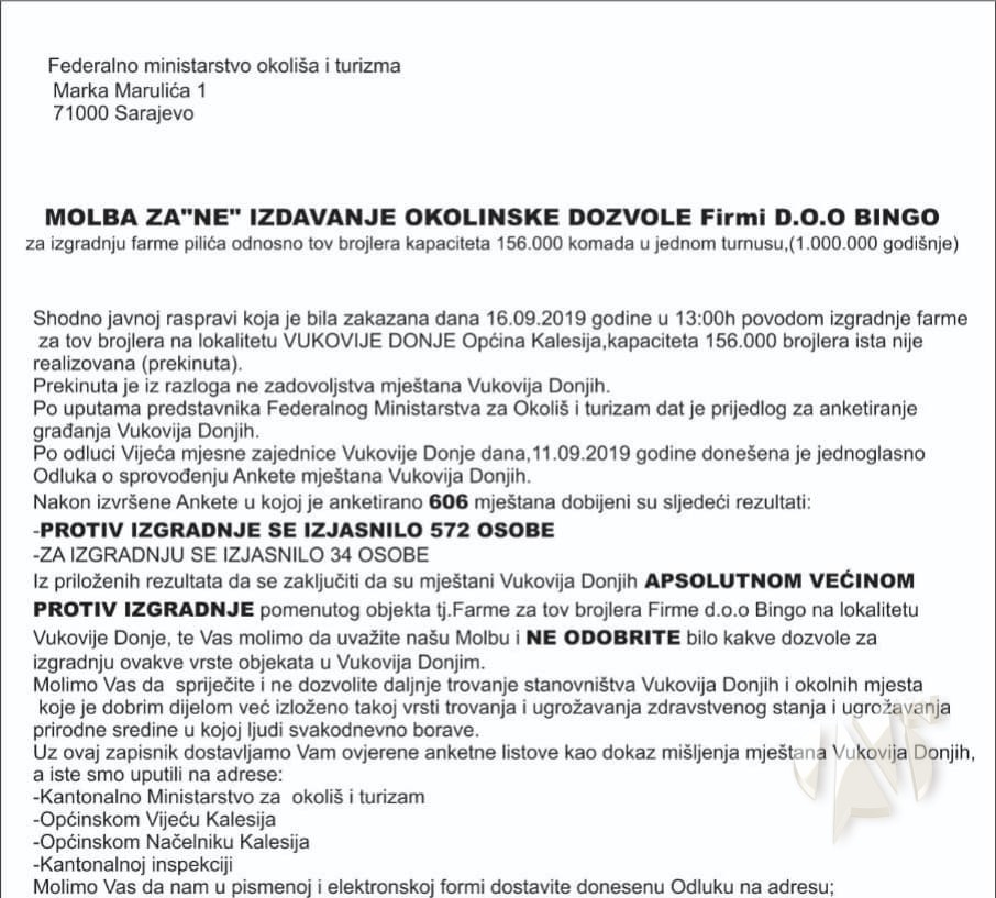 Anketirano je 606 mještana, a rezultati su pokazali da je ZA izgradnju njih 34, a protiv 572. Nakon utvrđenih rezultata uputili su molbu čiji sadržaj možete vidjeti na fotografiji ispod