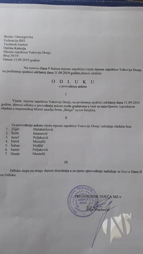 Kompanija Bingo d.o.o. Tuzla planira izgradnju farme za uzgoj pilića/brojlera na lokalitetu Vukovija.Vijeće MZ Vukovije Donje na proširenoj sjednici održanoj 11.9.2019. godine donijelo je Odluku o provođenju ankete među mještanima a u vezi izgradnje pomenute farme