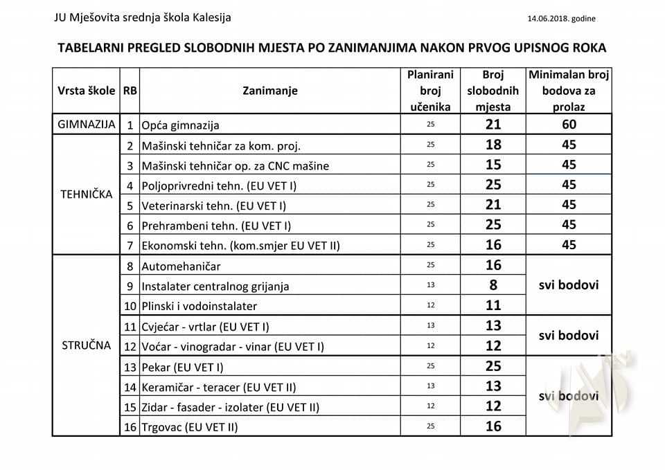Upis u prvi razred srednje škole počeo je 7.juna. U MSŠ Kalesija predviđen je upis 400 učenika u prvi razred školske 2018/2019.godine. Pored medicinske, osnovci mogu upisati i gimnaziju te od ostalih četvorogodišnjih škola mašinske, poljoprivredne, veterinarske i ekonomske tehničare.