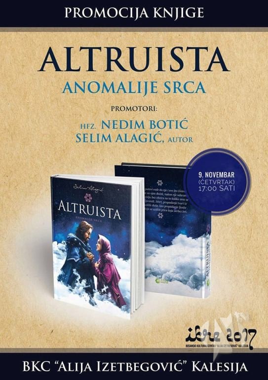 U četvrtak, 9. novembra, sa početkom u 17,00 sati, u Kalesiji, u sali BKC-a, održat će se promocija romana „Altruista – anomallije srca“ autora Selima Alagića. Osima autora, o knjizi će govoriti i hafiz Nedim Botić.