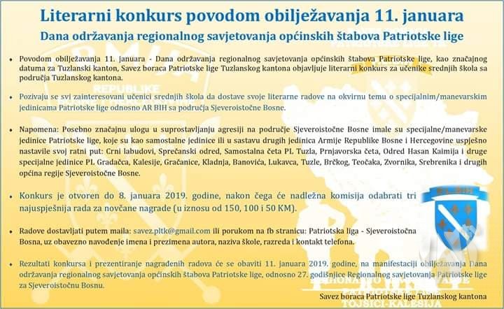 Povodom obilježavanja 11.januara – Dana održavanja regionalnog savjetovanja općinskih štabova Patriotske lige, kao značajnog datuma za Tuzlanski kanton i općinu Kalesija, Savez boraca Patriotske lige Tuzlanskog kantona objavljuje LITERARNI KONKURS za učenike srednjih škola sa područja Tuzlanskog kantona.