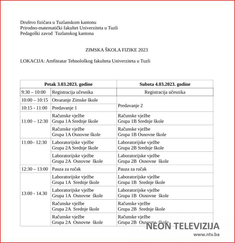 Društvo fizičara TK u saradnji sa Pedagoškim zavodom TK i Prirodno-matematičkim fakultetom, organizuje manifestaciju pod nazivom “Zimska škola fizike 2023”. Manifestacija će se održati u prostorijama Tehnološkog fakulteta 3. i 4. marta 2023.godine.