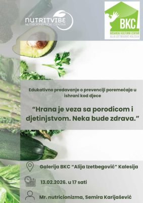 Edukativno predavanje o prevenciji poremećaja u ishrani kod djece pod nazivom “Hrana je veza sa porodicom i djetinjstvom. Neka bude zdrava” bit će održano u petak, 13. februara, sa početkom u 17;00h u galeriji Bosanskog kulturnog centra “Alija Izetbegović” u Kalesiji.