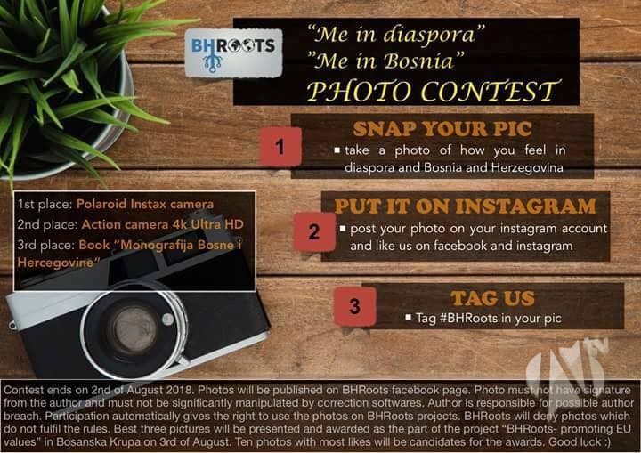 Mreža mldih BH dijaspore “BH Roots”, objavljuje foto-konkurs za sve mlade od 18 do 30 godina. Fotografije mogu biti napravljene profesionalnom opremom ili telefonom, bitno je da odražavaju kako se osjećate kao dio dijaspore ili kako doživljavate Bosnu i Hercegovinu. Konkurs je otvoren do 2.8.2018. a 3.8.2018. tri najbolje fotografije će biti objavljene u sklopu projekta “BH Roots – promoting European values”.