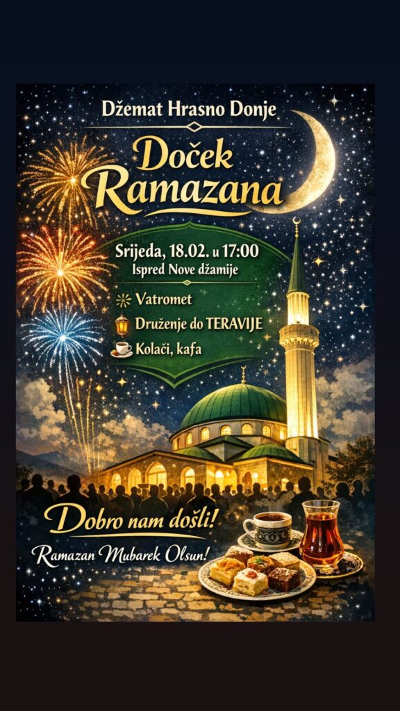 Džemat Hrasno Donje također priprema doček Ramazana, koji će biti upriličen u srijedu, 18. februara, s početkom u 17 sati ispred Nove džamije. Posjetitelje očekuje vatromet, druženje do teravije, kao i posluženje kolača i kafe. Ovaj događaj je prilika da zajednički dočekamo mubarek mjesec u radosti i zajedništvu, jačajući veze unutar naše džematske zajednice.
