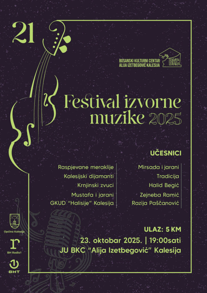 Bosanski kulturni centar „Alija Izetbegović“ Kalesija organizuje 21. Festival izvorne muzike – „Kalesija 2025“. Festival će se održati 23. oktobra 2025. godine u 19:00 sati u Bosanskom kulturnom centru, a učestvuju sljedeće izvorne grupe: Raspjevane meraklije, Kalesijski dijamanti, Mustafa i jarani, Tradicija, Krnjinski zvuci, Mirsada i jarani, Halid Begić, GKUD „Halisije“ Kalesija, i Zejnaba Ramić i Razija Paščanović.