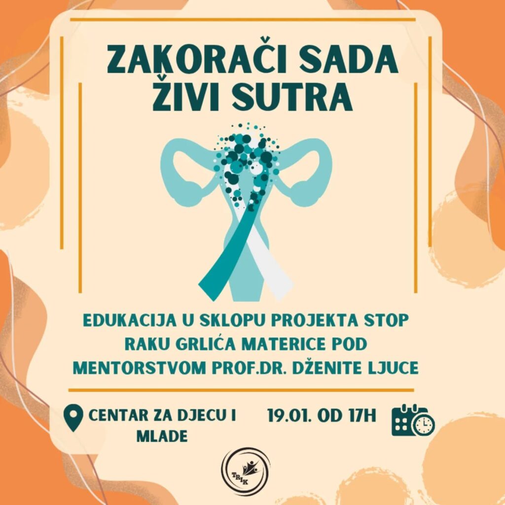 U okviru projekta “Stop raku grlića materice” Udruženje maldih “TRIK” Kalesija organizuje edukativnu radionicu koju će voditi studenti Medicinskog fakulteta Univerziteta u Tuzli: Majdančić Emina, Muratović Elma i Kašibović Asim. Radionica će biti održana 19.01. (ponedjeljak) u 17:00 sati u Centru za djecu i mlade.