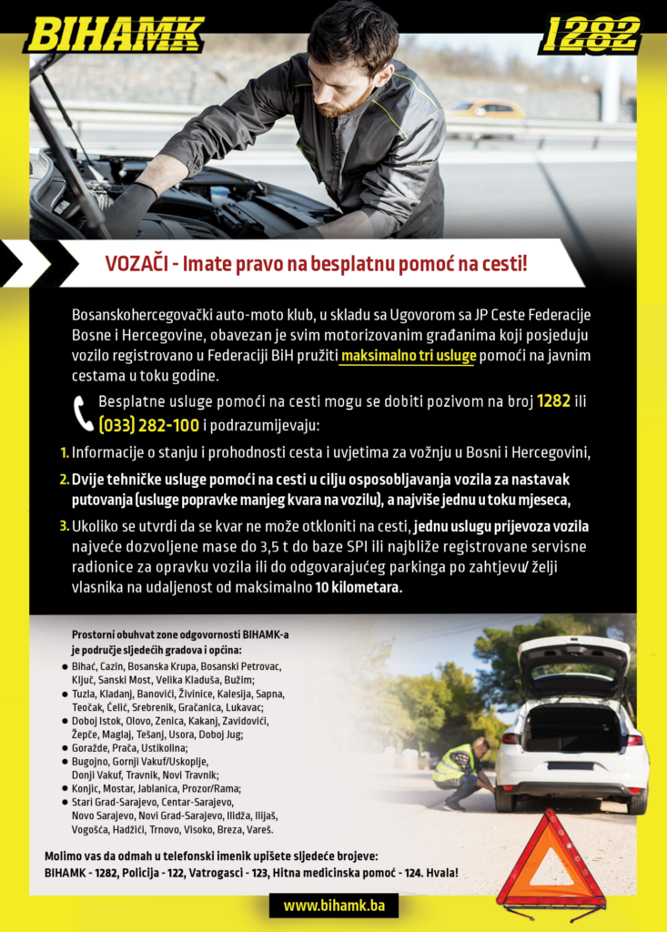 Besplatne usluge pomoći na cesti mogu se dobiti pozivom na broj 1282 ili (033) 282-