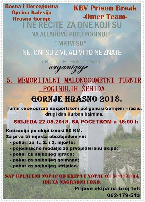 Klubu borilačkih vještina “Prison Break” iz Hrasna Gornjeg i ove godine pripala je organizacija Memorijalnog turnira poginulih šehida. Turnir će se održati 22.8.2018.godine sa početkom 16:00 sati na poligonu u Hrasnu Gornjem. Prijave ekipa za 5.Memorijalni turnir su u toku a koticacija iznosi 50 KM.