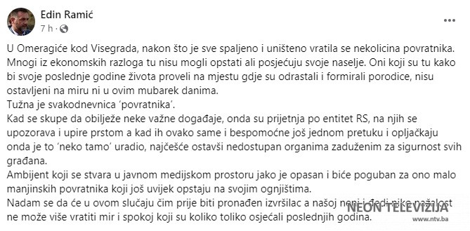 “U Omeragiće kod Višegrada, nakon što je sve spaljeno i uništeno vratila se nekolicina povratnika. Mnogi iz ekonomskih razloga tu nisu mogli opstati ali posjećuju svoje naselje. Oni koji su tu kako bi svoje poslednje godine života proveli na mjestu gdje su odrastali i formirali porodice, nisu ostavljeni na miru ni u ovim mubarek danima. Tužna je svakodnevnica ‘povratnika’. Kad se skupe da obilježe neke važne događaje, onda su prijetnja po entitet RS, na njih se upozorava i upire prstom a kad ih ovako same i bespomoćne još jednom pretuku i opljačkaju onda je to ‘neko tamo’ uradio, najčešće ostavši nedostupan organima zaduženim za sigurnost svih građana. Ambijent koji se stvara u javnom medijskom prostoru jako je opasan i biće poguban za ono malo manjinskih povratnika koji još uvijek opstaju na svojim ognjištima. Nadam se da će u ovom slučaju čim prije biti pronađen izvršilac a našoj neni i đedi niko nažalost ne može više vratiti mir i spokoj koji su koliko toliko osjećali poslednjih godina.”, napisao je Edin Ramić, federalni ministar raseljenih osoba i izbjeglica.