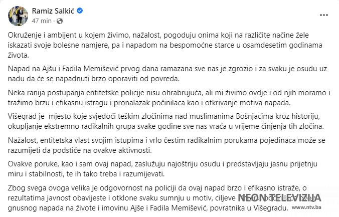 “Okruženje i ambijent u kojem živimo, nažalost, pogoduju onima koji na različite načine žele iskazati svoje bolesne namjere, pa i napadom na bespomoćne starce u osamdesetim godinama života. Napad na Ajšu i Fadila Memišević prvog dana ramazana sve nas je zgrozio i za svaku je osudu uz nadu da će se napadnuti brzo oporaviti od povreda. Neka ranija postupanja entitetske policije nisu ohrabrujuća, ali mi živimo ovdje i od njih moramo i tražimo brzu i efikasnu istragu i pronalazak počinilaca kao i otkrivanje motiva napada. Višegrad je mjesto koje svjedoči teškim zločinima nad muslimanima Bošnjacima kroz historiju, okupljanje ekstremno radikalnih grupa svake godine sve nas vraća u vrijeme činjenja tih zločina. Nažalost, entitetska vlast svojim istupima i vrlo čestim radikalnim porukama pojedinaca može se razumijeti da podstiče na ovakve aktivnosti. Ovakve poruke, kao i sam ovaj napad, zaslužuju najoštriju osudu i predstavljaju jasnu prijetnju miru i stabilnosti, te ih tako treba i razumijevati. Zbog svega ovoga velika je odgovornost na policiji da ovaj napad brzo i efikasno istraže, o rezultatima javnost obavijeste i otklone svaku sumnju u motiv, ciljeve i imena počinilaca ovog gnusnog napada na živote i imovinu Ajše i Fadila Memišević, povratnika u Višegradu.”