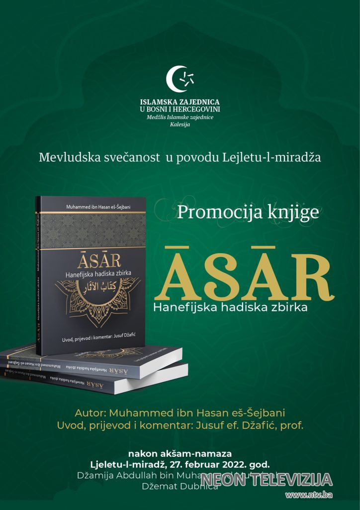Medžlis Islamske zajednice Kalesija povodom mubarek-noći Lejletul-miradža organizuje vjerski program u okviru kojeg će biti upriličena i promocija knjige „Asar – Hanefijska zbirka hadisa“, autora Muhammeda ibn Hasana eš-Šejbanija. Navedeno djelo je preveo Jusuf Džafić, koji će biti i promotor knjige.