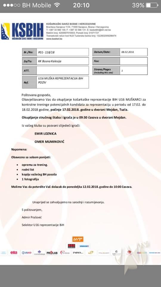 Iz uprave KK “Bosna” Kalesija kažu da poziv za U-16 reprezentaciju dvojice košarkaša od velikog je značaja za klub jer to potvrđuje činjenicu da se sa djecom radi na kvalitetan i profesionalan način, a naravno i činjenicu da Kalesija ima jako talentovanu djecu koja žele da napreduju i razvijaju svoj talenat.
