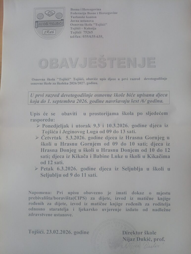 Osnovna škola “Tojšići”, obaviće upis djece u prvi razred devetogodišnje osnovne škole za školsku 2026/2027 godinu.