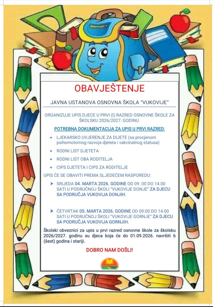 Školski obveznici za upis u prvi razred osnovne škole za školsku 2026/2027. godinu su djeca koja će do 01.09.2026. navršiti 6 (šest) godina i stariji.