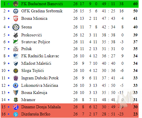 Bod manje ima ekipa FK “Bosna” Kalesija koja zauzima 13 mjesto. Nogometaši “Bosne” snage na terenu odmjerit će sa ekipom Priluka. Pomenuta utakmica igra se sutra u Priluku. Ekipa iz Priluka nalazi se na 7 mjestu sa 35 osvojenih bodova.