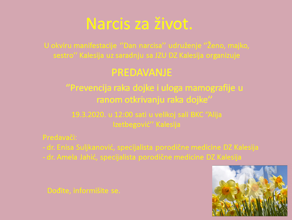 Udruženje “Ženo, majko, sestro” u okviru manifestacije “Dan narcisa” organizuje predavanje na temu “Prevencija raka dojke i uloga mamografije u ranom otkrivanju raka dojke”. Pomenuto udruženje predavanje organizuje u saradnji sa JZU DZ Kalesija.