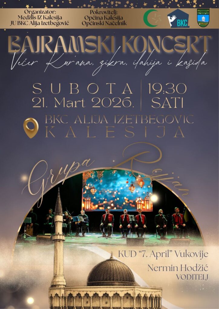 Medžlis Islamske zajednice Kalesija i JU BKC “Alija Izetbegović” Kalesija organizuju tradicionalnu Bajramsku akademiju, koja će biti upriličena drugi dan Bajrama, 21. marta (subota) sa početkom u 19:30 sati.