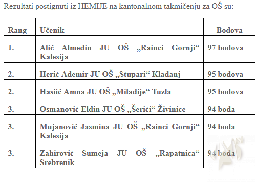 U organizaciji Pedagoškog zavoda Tuzlanskog kantona u JU OŠ „Pasci“ u Tuzli 04.05.2019.godine (subota) održano je kantonalno takmičenje iz HEMIJE za osnovne škole. Takmičenju je pristupilo 58 učenika iz 43 škole sa područja Tuzlanskog kantona.
