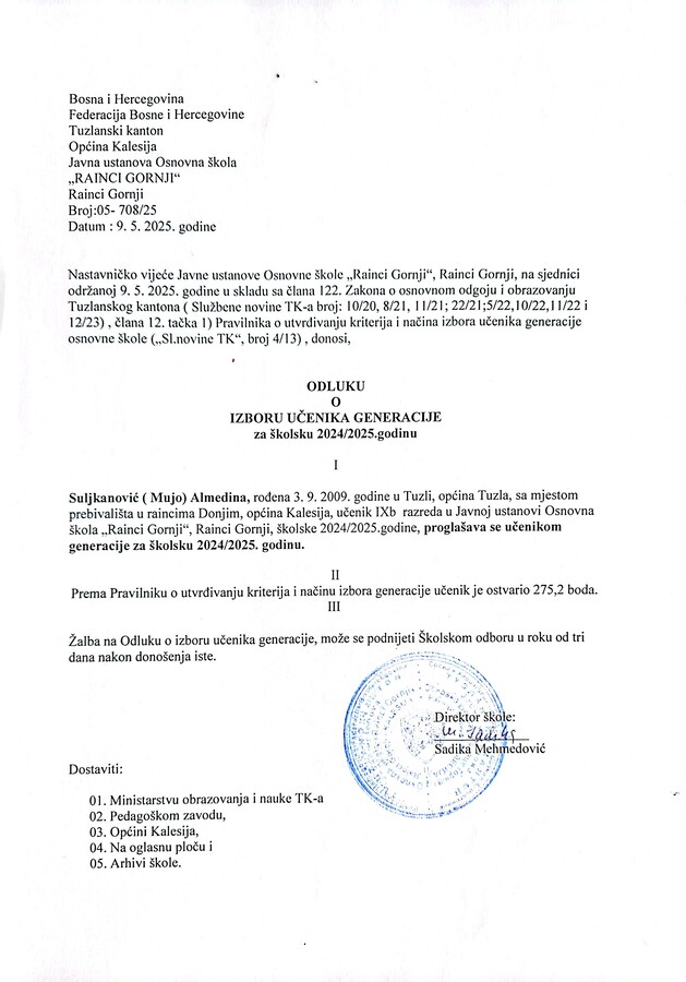 Nastavničko vijeće OŠ “Rainci Gornji” je na sjednici održanoj 9. maja donijelo Odluku o proglašenju učenika generacije za školsku 2024/2025. godinu.