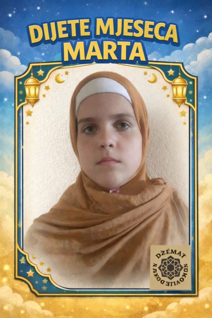 Amina je tokom mjeseca marta ostvarila izvanredan rezultat sakupivši ukupno 260 bodova, čime je zasluženo ponijela ovu titulu. Posebno se ističe svojom redovnošću na mektebskoj nastavi, kao i aktivnim učešćem na mektebskim takmičenjima.