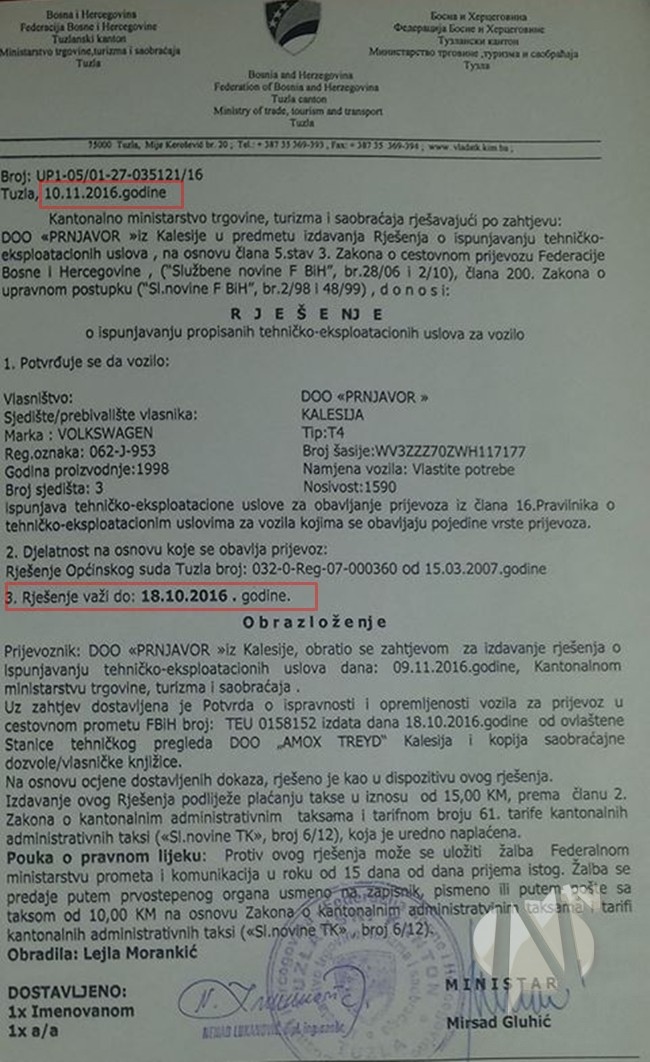 Nakon svih prikupljenih dokumenata i uplata Fazliću je stigla i obavjest iz Ministarstva da mu dozvoljavaju ili daju odobrenje za bavljenje prevoza, ali samo do 18.10.2016. godine.