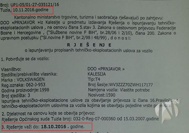 Nakon svih prikupljenih dokumenata i uplata Fazliću je stigla i obavjest iz Ministarstva da mu dozvoljavaju ili daju odobrenje za bavljenje prevoza, ali samo do 18.10.2016. godine.