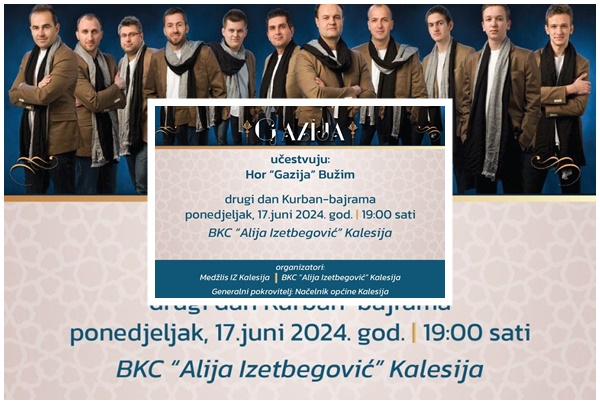 Medžlis Islamske zajednice Kalesija i JU BKC “Alija Izetbegović” Kalesija organizuju Bajramsku akademiju. Akademija će biti upriličena drugi dan Bajrama odnosno 17. juna sa 19:00 sati. Učestvuje hor “Gazija” Bužim.