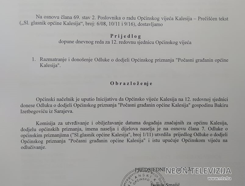 Za dodjelu priznanja “Počasni građanin općine Kalesija” predložen je Bakir Izetbegović od strane općinskog načelnika Seada Džafića.