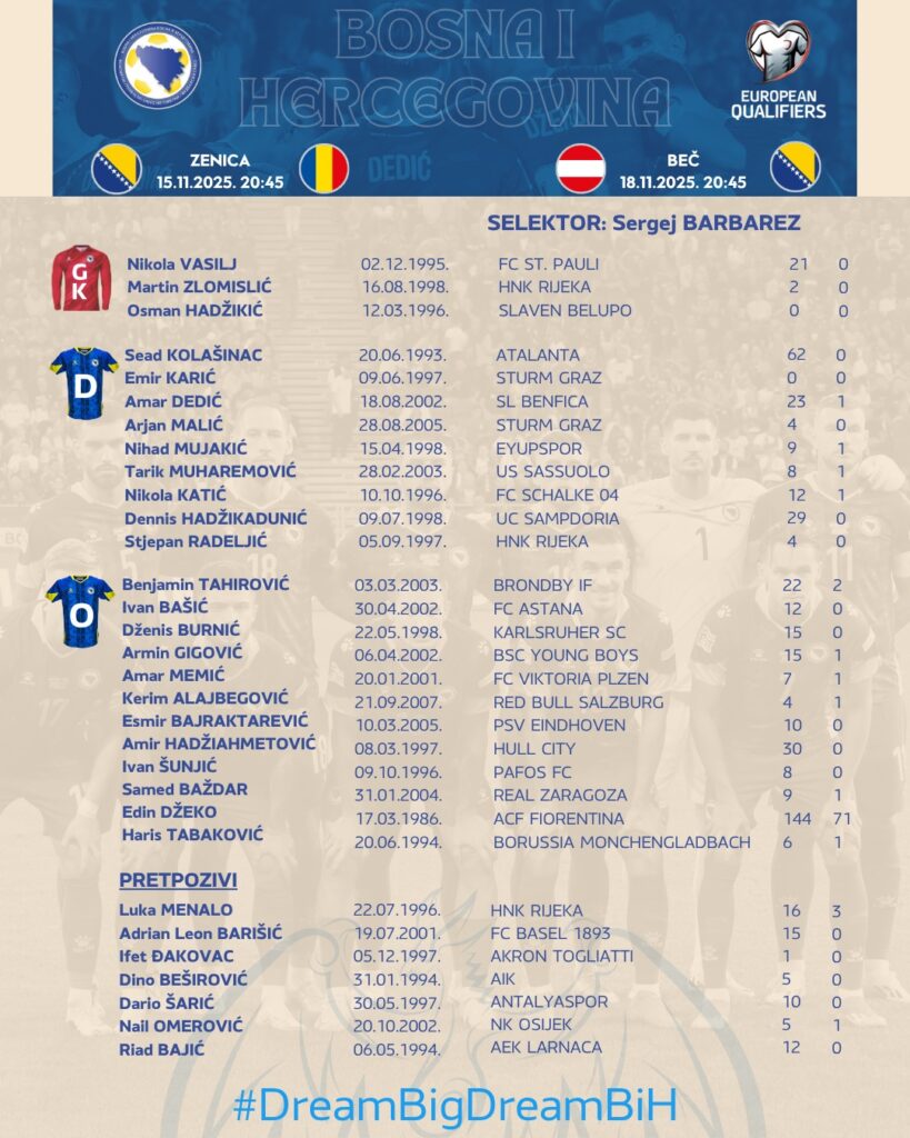 Seniorska reprezentacija Bosne i Hercegovine će narednog mjeseca odigrati dvije utakmice u okviru grupe H kvalifikacija za Svjetsko prvenstvo 2026. Zmajevi će 15. novembra na „Bilinom polju“ u Zenici dočekati selekciju Rumunije, a tri dana poslije će na „Ernst-Happel“ stadionu u Beču gostovati selekciji Austrije. Selektor Sergej Barbarez danas je objavio spisak igrača na koje računa u ovim utakmicama.