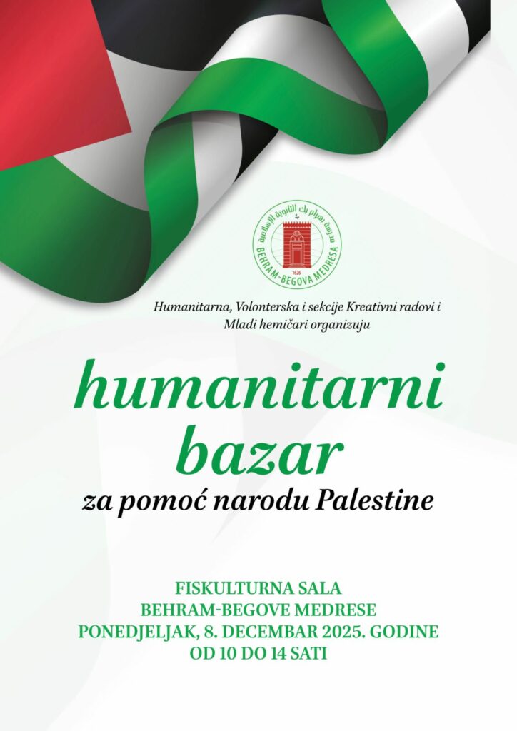 Behram-begova medresa u Tuzli organizuje humanitarni bazar za pomoć narodu Palestine. Bazar će se održati 8. decembra 2025. godine u fiskulturnoj sali škole, u terminu od 10 do 14 sati.