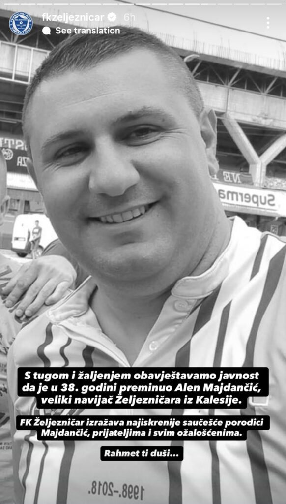 “S tugom i žaljenjem obavještavamo javnost da je u 38. godini preminuo Alen Majdančić, veliki navijač Željezničara iz Kalesije. FK Željezničar izražava najiskrenije saučešće porodici Majdančić, prijateljima i svim ožalošćenima. Rahmet ti duši…”, stoji u poruci FK Željezničar.