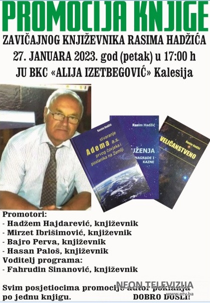 U velikoj sali JU BKC „Alija Izetbegović“ Kalesija, 27. januara (petak), sa početkom u 17,00 sati, održat će se promocija tri nove knjige Rasima Hadžića.