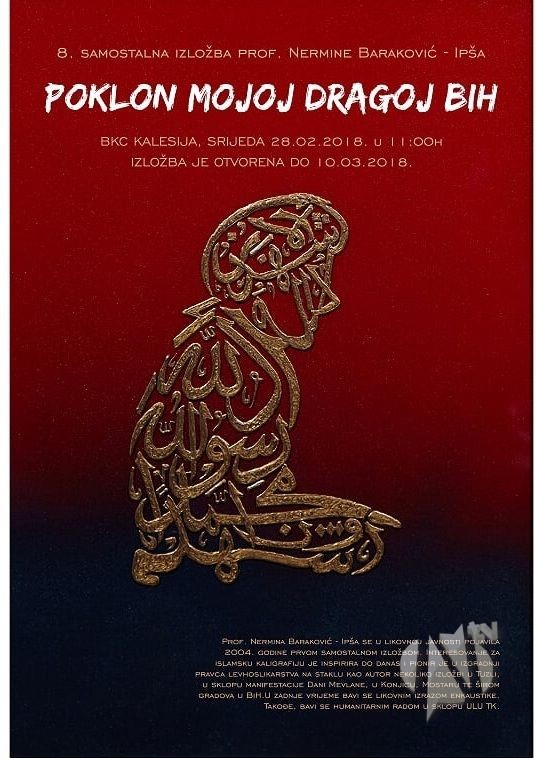Otvaranje izložbe slike pod nazivom „Radosti praznika – Poklon mojoj dragoj BiH“ predviđeno je za 11,00 sati. Nermina Baraković – Ipša je članica Udruženja likovnih umjetnika Tuzlanskog kantona i ovo je njena 8. samostalna izložba. Do sada je izlagala u Tuzli, Sarajevu, Konjicu… Izložba je prodajnog karaktera i slike će biti postavljene u galeriji BKC-a do 10. marta.