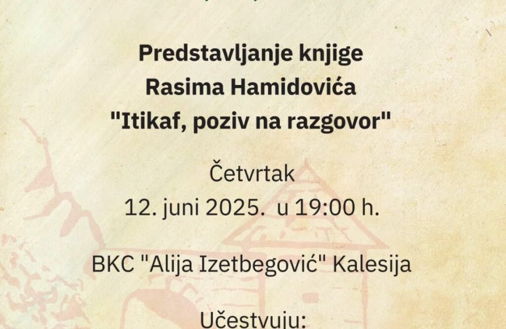 U okviru kulturno – vjerske manifestacije XXII Dani Hasana Kaimije večeras će u Bosanskom kulturnom centru “Alija Izetbegović” u Kalesiji sa početkom u 19:00 sati biti upriličena promocija kalesijskog imama Rasima Hamidovića “Itikaf, poziv na razgovor”.