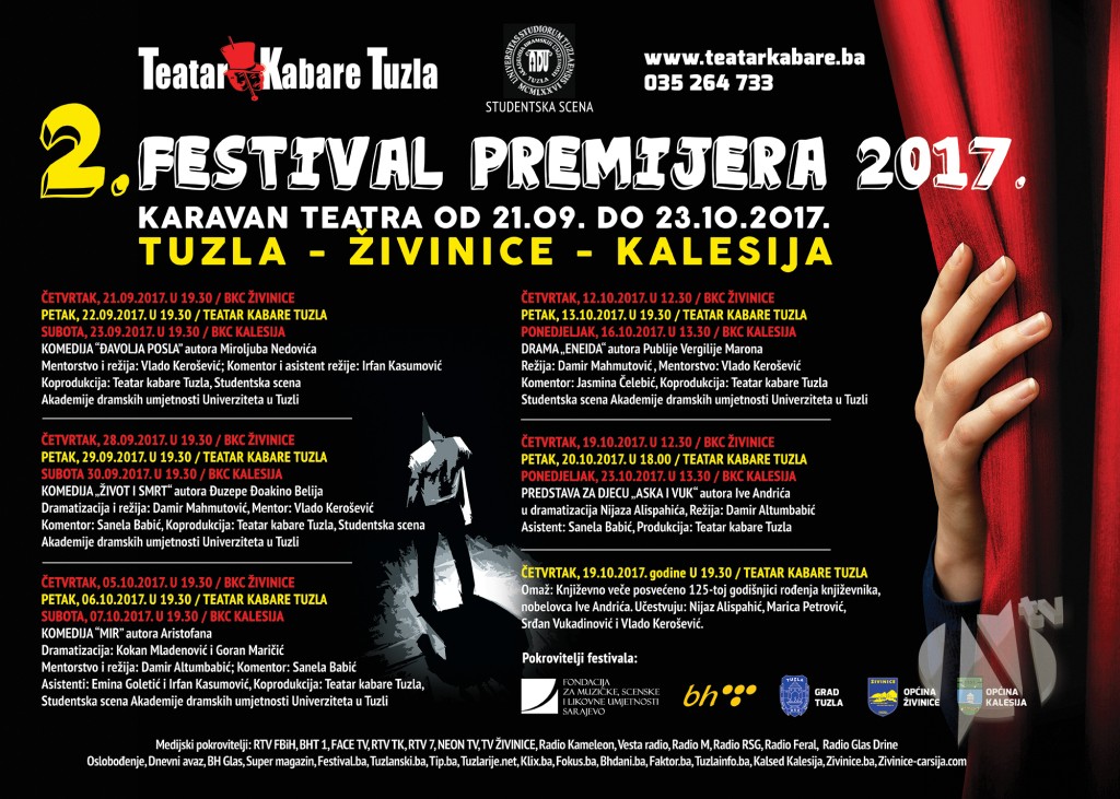 Već smo objavili da je i JU BKC „Alija Izetbegović“ Kalesija, zajedno sa Teatrom kabere Tuzla i JU BKC Živinice, jedan od suorganizatora Festivala premijera. Ovogodišnji festival ima i podnaslov „Karavan teatra“ jer nudi pet predstava koje će se igrati u narednih mjesec dana imati u Tuzli, Živinicama i Kalesiji. Festival u Kalesijiće se održati pod motom „Subotom u pozorište“ jer će se predstave za odrasle igrati subotom, od 19,30 sati, a dvije predstave namijenjene učenicima igrat će se ponedjeljkom. Sve predstave su rađene u koprodukciji Teatra kabare Tuzla i Studentske scene Akademije dramskih umjetnosti Univerziteta u Tuzli