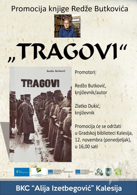 U kalesijskoj Gradskoj biblioteci, povodom obilježavanja 100-te godišnjice završetka Prvog svjetskog rata, bit će upriličena promocija knjige „Tragovi“ doc. dr. Redže Butkovića iz Živinica. Osim autora, o knjizi će govoriti i književnici Zlatko Dukić i Fahrudin Sinanović.