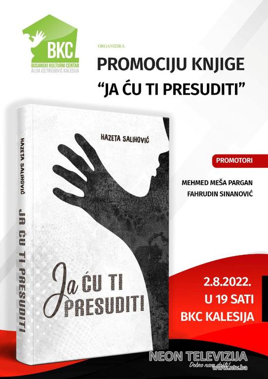 U utorak, 02. avgusta, u 19,00 sati, u velikoj sali kalesijskog BKC-a, održat će se promocija knjige “Ja ću ti presuditi” autorice Hazeta Hamzić Salihović. Riječ je o njenom novom romanu koji, između ostalog, svjedoči o tome kako rat uzima one koji misle da su ga preživjeli.