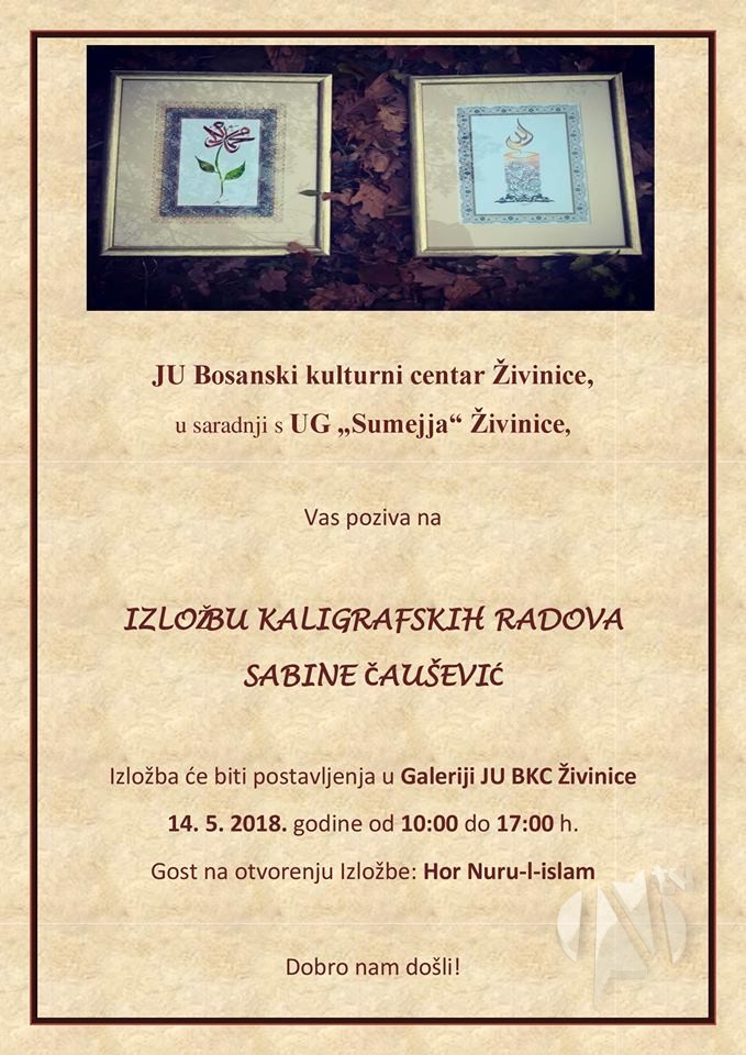 Danas, u 10:00 sati otvorena je izložba kaligrafskih radova mlade umjetnice Sabine Čaušević.  Organizator izložbe je JU BKC Živinice u saradnju sa UG “Sumejja” Živinice .