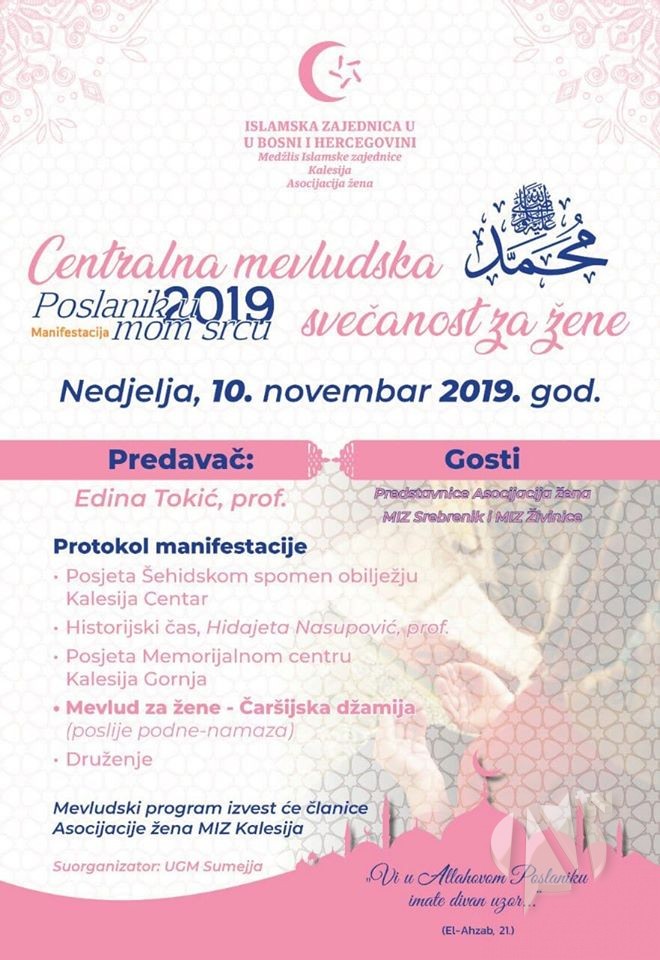 U nedjelju, 10. novembra 2019. godine, nakon podne-namaza u Čaršijskoj džamiji u Kalesiji biće izveden mevludski program za žene.