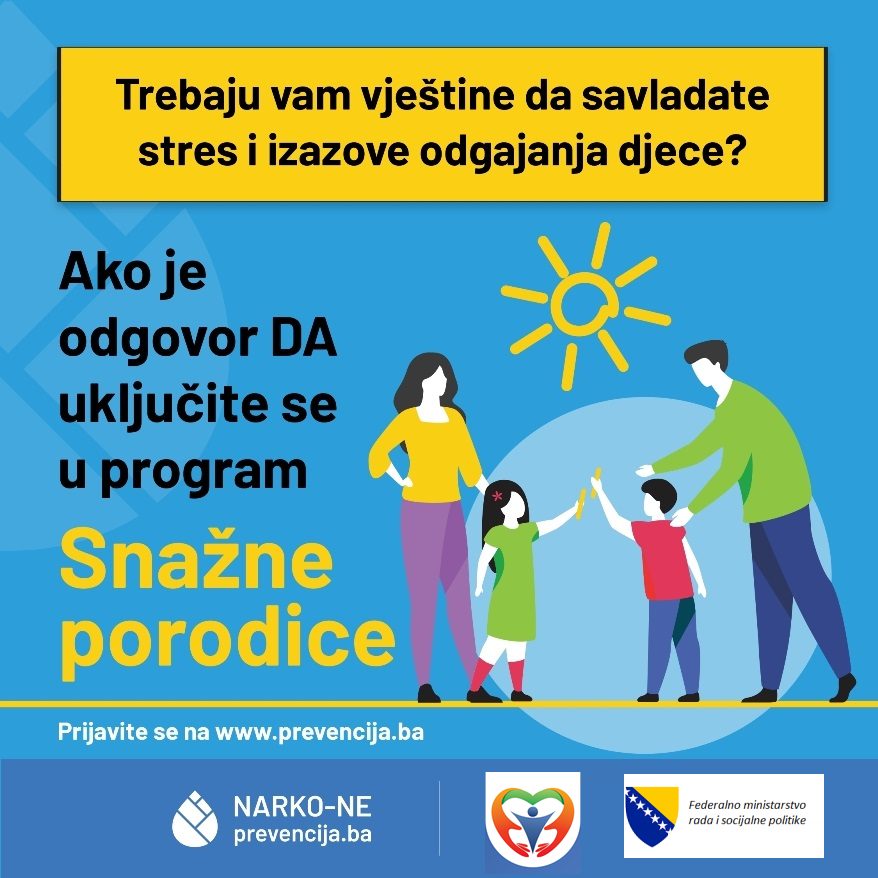 Projekat “Snažne porodice” Centar za socijalni rad Kalesija realizuje u saradnji sa Udruženjem za prevenciju ovisnosti NARKO NE uz podršku Federalnog ministarstva rada i socijalne politike sa ciljem jačanja kapaciteta porodice za nošenje sa stresom u svakodnevnom funkcionisanju.