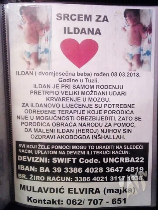 Samo uz pomoć dobrih ljudi mali Ildan može otići na liječenje i imati sretno i bebrižno djetinjstvo, kao sva ostala djeca. Svi zainteresovani koji su u mogućnosti da pomognu malom Ildanu, to mogu uraditi uplatom na devizni ili žiro račun koji se nalazi na fotografiji.